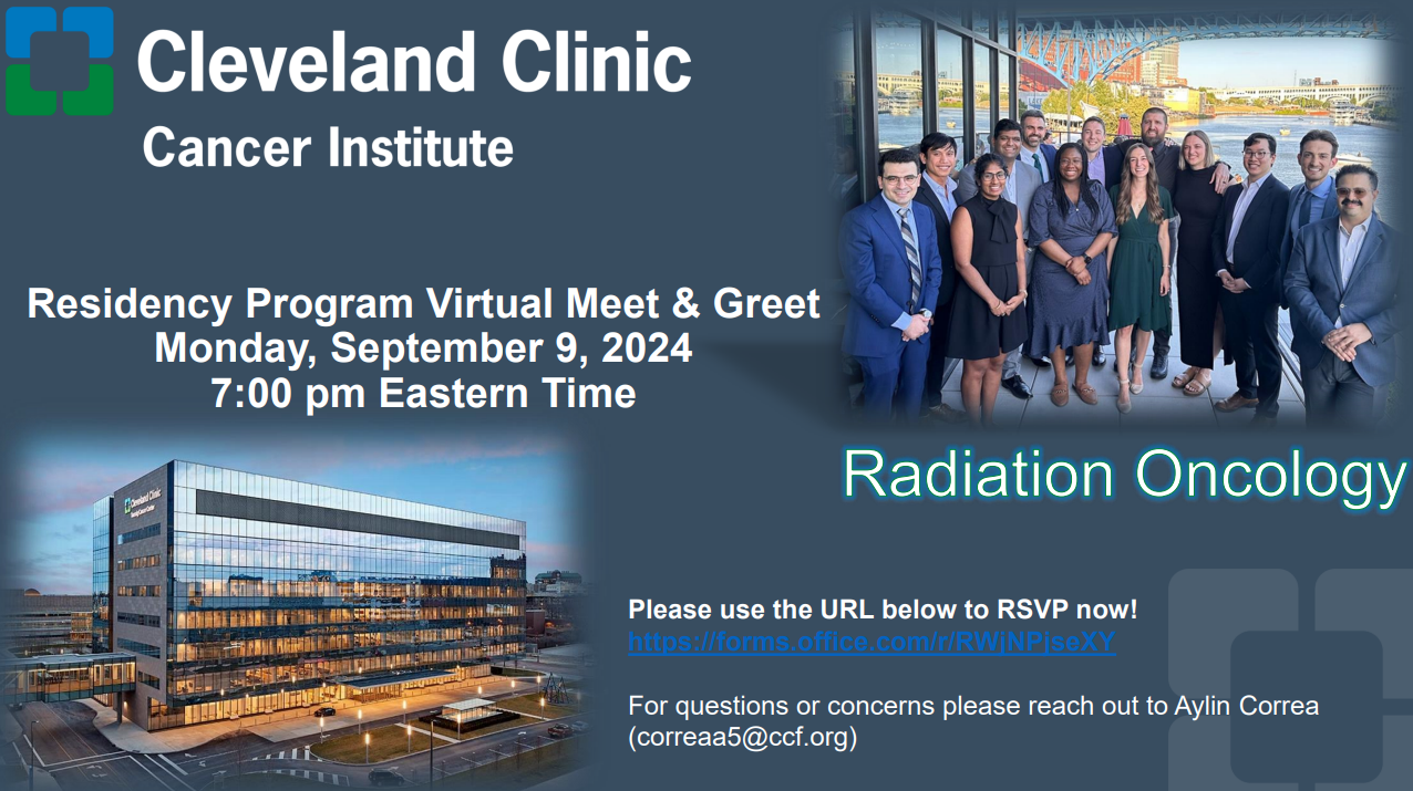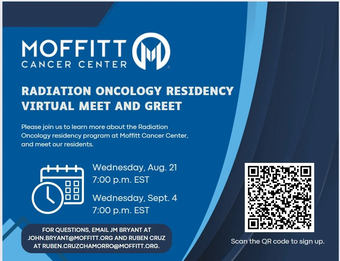 We will be having sessions on Wednesday 8/21/2024 and 9/4/2024 at 7 pm EST. Our program has 10 slots that rotates between 2 to 3 residency classes every other year. Program highlights include: High-Volume Cancer Center, Dedicated Proton/Pediatric Rotation, Generous Support for Research and Conference Attendance, MRI Linac with Training Elective, and Formal Leadership Training Course.
